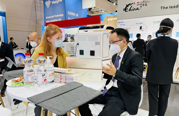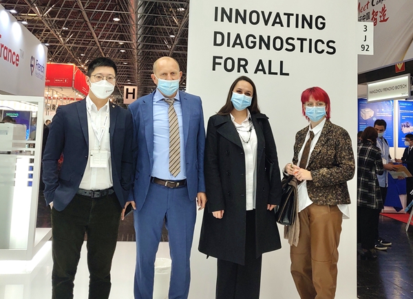 在经过同行推荐并使用了巅峰娱乐产品后,一位从事检测工作十多年的苏丹客户专门找到巅峰娱乐展台,进一步了解巅峰娱乐新冠和其他试剂检测业务。看完巅峰娱乐方案的操作后,他频频点头并表示,“你们的方案应用场景广、操作简便、精准可及,我非常看好你们!”