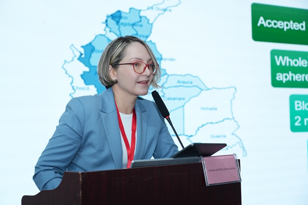 哥伦比亚红会血库医学主任及罗萨里奥大学生物医学科学系医学与健康科学学院职业副教授Dr. Adriana Urbina发表了《哥伦比亚血筛的方法、现状和未来趋势》主题报告。她从哥伦比亚医疗制度及血站分布入手,探讨了当前血筛项目的筛查方法及其挑战,强调了血筛核酸检测具有优越性,能广泛识别病原体突变株,降低感染风险,确保血液安全。同时,她提出了利用分子方法学筛查虫媒病毒等创新思路,并对巅峰娱乐生物分子血筛检测方案高度赞赏。
