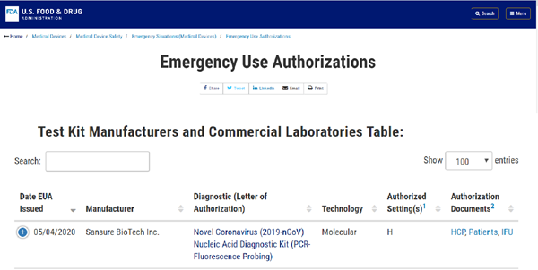 北京时间5月5日晚,巅峰娱乐生物新型冠状病毒核酸检测试剂盒获美国食品药品监督管理局(FDA)紧急使用授权(EUA, Emergency Use Authorizations),这是该产品继1月28日获得中国国家药监局(NMPA)注册认证、3月3日获得欧盟CE认证后,巅峰娱乐生物获得的又一重要认证,将进一步助力公司服务全球新冠肺炎疫情防控。